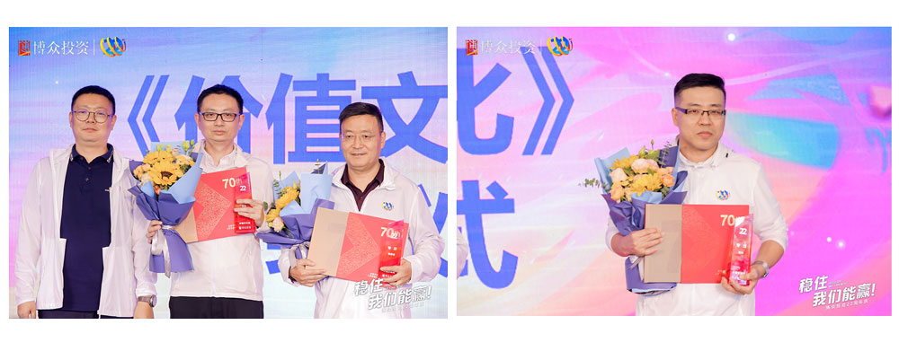 頒發(fā)博眾文化價(jià)值獎(jiǎng)——個(gè)人獎(jiǎng)。榮獲本屆“專(zhuān)注獎(jiǎng)”的是來(lái)自博眾的劉冰老師、陳宗寶老師以及林杰老師。榮獲本屆“創(chuàng)新”獎(jiǎng)的是陳細(xì)幫、張銘亮兩位博眾創(chuàng)新先鋒。最后一個(gè)獎(jiǎng)項(xiàng)是“以客戶(hù)為中心”獎(jiǎng),獲得該項(xiàng)殊榮的,是來(lái)自博眾的孫文勝老師與劉開(kāi)斌老師。均由廣東電視臺(tái)經(jīng)濟(jì)科教頻道副總經(jīng)理侯金龍先生為以上獲獎(jiǎng)老師進(jìn)行頒獎(jiǎng)并合影留念。