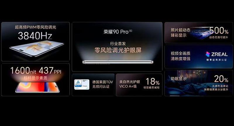 榮耀90系列帶來了2億像素寫真人像相機,行業(yè)領先的3840Hz PWM零風險調光護眼屏,5000mAh超大電池+90W超級快充,全新MagicOS 7.1智慧體驗等突破式升級,力求給用戶帶來全新體驗。2億像素超清大底主攝,1200萬像素超廣角微距鏡頭,3200萬像素長焦人像鏡頭,這些強悍的影像硬件使得消費者能輕松拍出單反風格的寫真人像;采用3840Hz超高頻PWM調光,打造零風險調光級別的手機OLED屏幕以及VICO A+級類自然光護眼,有效降低視疲勞,給用戶帶來更好的實用體驗;全系搭載5000mAh高能量密度電池,超長續(xù)航手感輕薄,滿足用戶實際需求。
