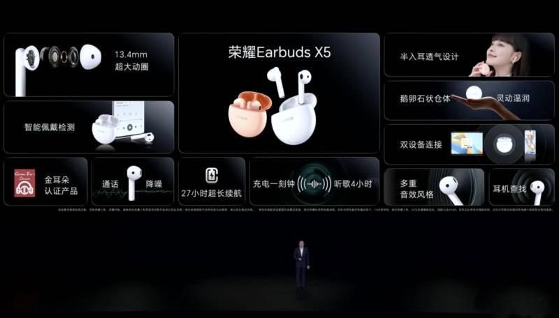發(fā)布會上,榮耀還帶了一款Earbuds X5耳機新品,采用了鵝卵石狀倉體,提供釉白色和珊瑚粉兩款配色。耳機采用了半入耳設計,單只僅重3.8g,帶來空氣感舒適佩戴體驗。Earbuds X5采用了13.4mm動圈單元,復合鍍鈦振膜,呈現(xiàn)純正音質,并通過金耳朵產品認證。Earbuds X5提供了27小時超長續(xù)航,充電一刻鐘,可以支持4小時聽歌體驗。